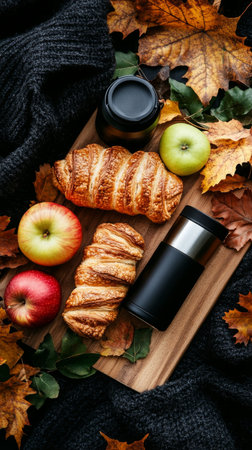 A warm and inviting breakfast spread features flaky pastries, fresh apples, and a thermos, set against a backdrop of colorful autumn leaves.