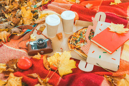 Autumn picnic setting with pumpkin pie, warm drinks and pumpkins on a blanket with fall leaves for a cozy seasonal mood
