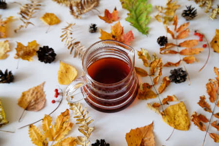 Sweet red tea in a box with autumn leaves