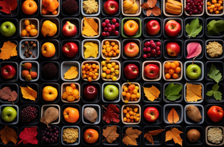 Autumn fruits and vegetables background. Top view. Flat lay.