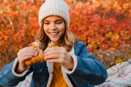 Smiling little girl eating croissant in the autumn park, sitting on blanket