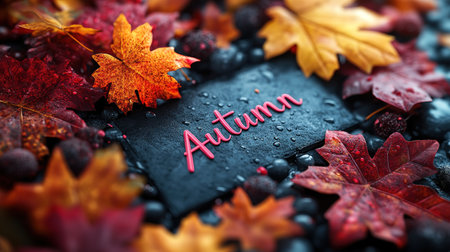 Autumn leaves and red berries scattered on a dark surface with warm light, creating a rich and seasonal atmosphere perfect for fall-themed designs.