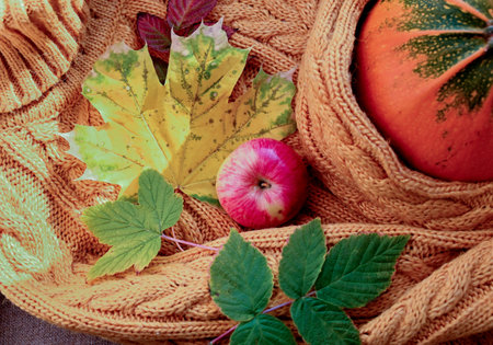 Autumn theme with autumn fruits and colors. A yellow sweater with a cup of tea on it, a book, autumn leaves, small scented candles and various fruits. Month October abstract background
