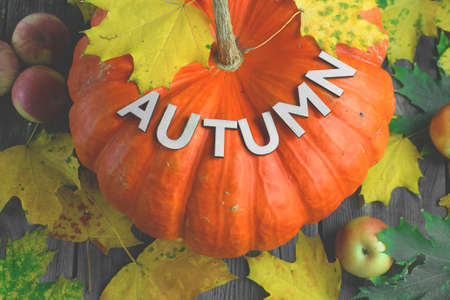 Autumn letters with yellow and red leaves and fall fruits. Minimal flat lay creative concept. Autumn composition. Dried leaves on background.