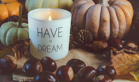 A lighted candle surrounded by hazelnuts, pumpkins and pine cones