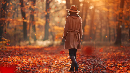 Woman walking in autumn forest with fallen leaves and warm sunlight. Concepts of fall season, outdoor activity, nature exploration, tranquility.. Copy space.