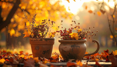 Rustic pots hold autumnal arrangements of leaves and berries on a table with fallen leaves.