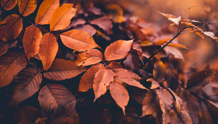 Golden autumn leaves bathed in sunlight. A close-up shot of the vibrant colors and texture of nature in fall