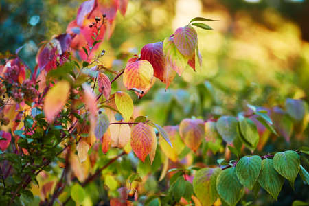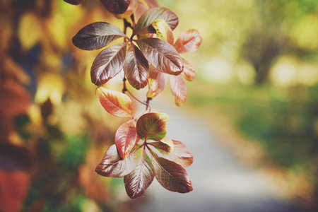 Beautiful autumn nature background with colorful leaves on branch in soft focus. Abstract. Vintage toning