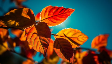 Vibrant autumn foliage on maple tree in tranquil forest scene generated by artificial intelligence