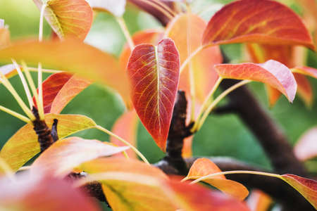 Photo of autumn leaves on a tree. Golden autumn. Bright red, yellow, orange background