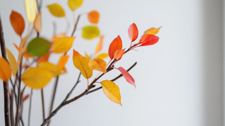 A close-up of vibrant fall leaves on thin branches, floating softly in the wind with a white backdrop