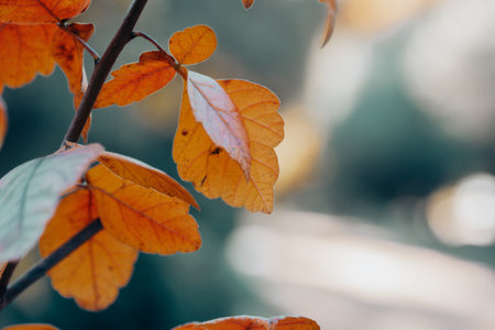 Close up of a different colored leaves in autumn. Blur orange bokeh background