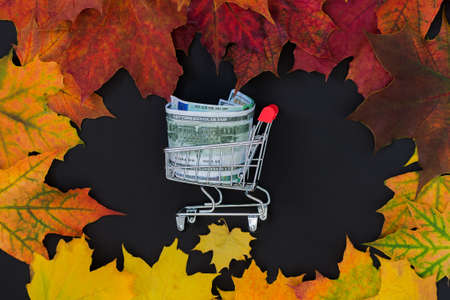 autumn sale layout on dark background, black friday, shopping basket next to coins and bills, orange pumpkins made of yarn and leaves, online shopping