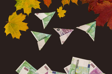 small planes from bills on a black background together with autumn leaves. Idea - autumn sales, Black Friday, loss of money, crisis. Horizontal photo.