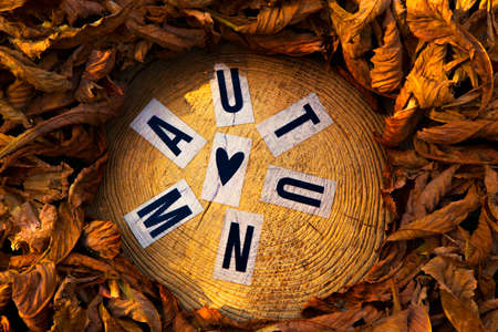 The inscription in white letters the word AUTUMN on a background of yellow leaves on the grass in the autumn forest