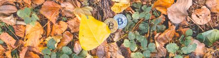 Golden and silver bitcoin in autumn in forest , park. Long banner photo .Concept of modern exchange value, electronic money virtual pay , future concept. Used for investing in stocks and market