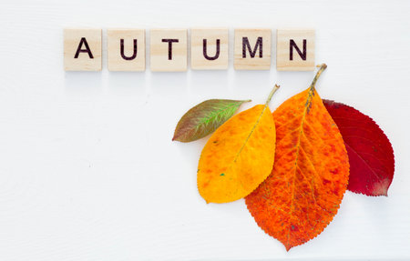 The concept of the fall season. fall time. Bright, autumn leaves and the word autumn from wooden blocks on a white wooden table. Copy of the text space.
