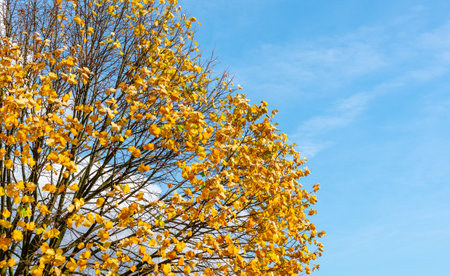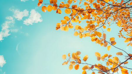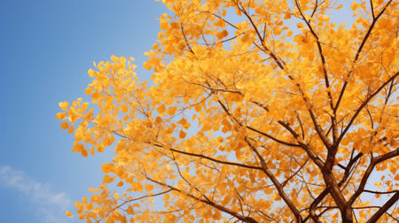 Vibrant yellow autumn leaves stand out against a bright blue sky with scattered white clouds. The image captures the beauty and tranquility of the fall season with its warm colors and clear skies.