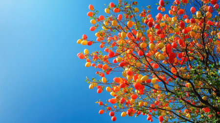A vibrant tree adorned with colorful balloons in shades of red and yellow against a clear blue sky. This cheerful scene reflects the joy of celebration and festive occasions.