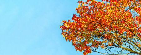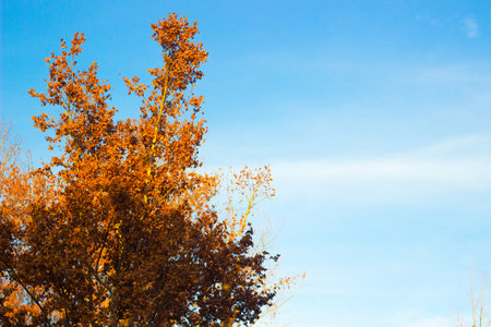 Beautiful autumn landscape with colorful foliage on blue sky. Colorful background, fall backdrop