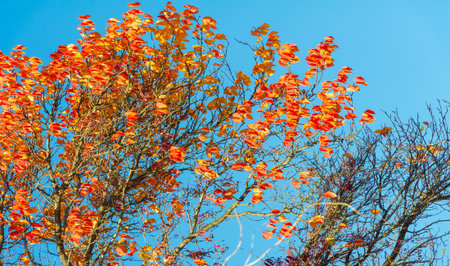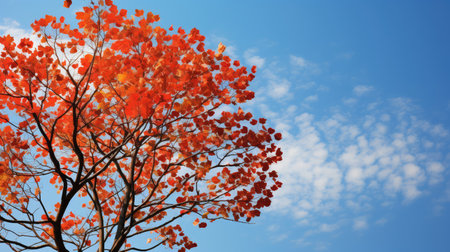 A stunning display of vibrant orange leaves captures the essence of autumn, set against a clear blue sky, creating a serene and peaceful outdoor scene.