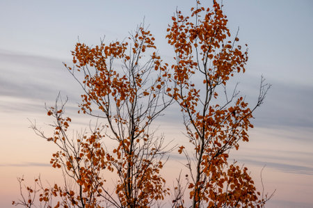 Bright maple tree with yellowed golden, orange leaves on branches against clear sky on sunny autumn day tinted in peach-pink color.Hello autumn concept, change of seasons, nature background.Copy space.