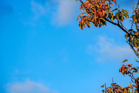 Autumnal and foliage with cloudy sky background. Autumn arrives, maple leaves turn from green to red and brown (with copy space)