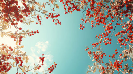 A stunning view of vibrant red berries framed by lush branches under a bright blue sky. This image evokes feelings of tranquility and natural beauty, perfect for outdoor themes.