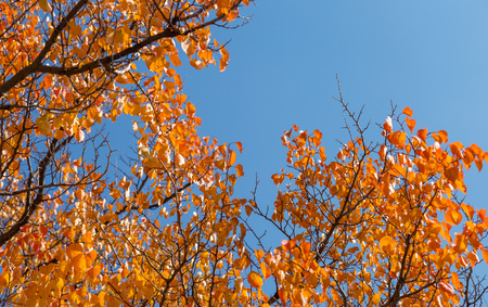 Yellow autumn leaves of trees on a clear blue sky
