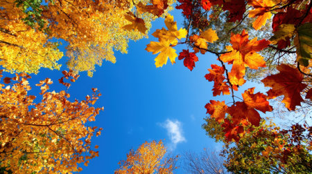 Stunning autumn scene featuring vibrant orange and yellow leaves against a clear blue sky. A picturesque display of nature's beauty in the fall season.
