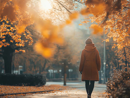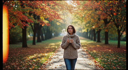 A woman in a cozy sweater walking down a tree-lined path in autumn, surrounded by colorful leaves