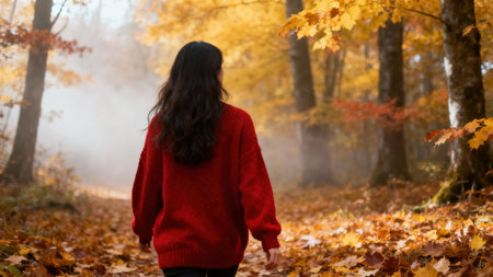 Moody scene of an adult woman wearing a bright red cable knit sweater, seen from behind on a path covered in fallen autumn leaves, illuminated by soft golden mist.