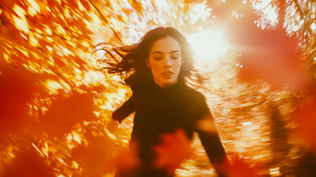 A dreamy autumnal scene of a woman joyfully dancing amongst falling leaves in a sunlit forest. Warm colors and blurred motion capturing the beauty of the season.