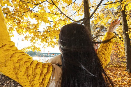 Woman walking alone in a park during a beautiful fall afternoon by the river, enjoying the golden foliage