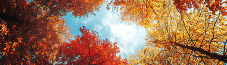 Looking up through the canopy of autumn trees with vibrant red and yellow leaves against a bright blue sky.