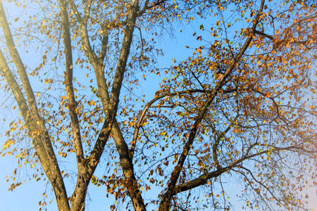 Yellow and orange leaves, autumn season with sky in the background
