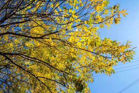 Blue sky and sunny weather in the autumn season, deciduous trees covered with yellow foliage in September