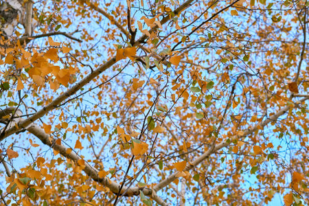 birch trees photographed during the autumn season in the city park, yellowed foliage, small DOP, Belarus