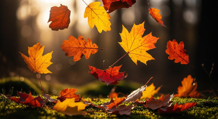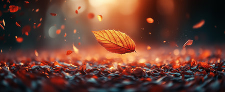 Falling autumn leaves in a park on a sunny afternoon. Warm, orange tones prevail. The serene image captures the beauty of the season.