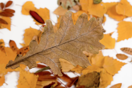 oak leaf on a background of yellow autumn leaves