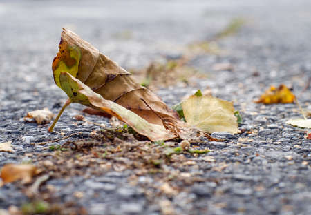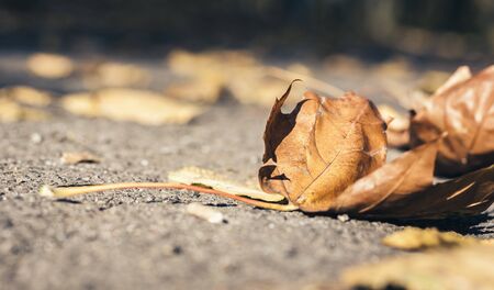 Dry yellow autumn leaves lies on asphalt sidewalk. Beautiful city background of Fall season.