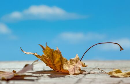 Dry maple leaves on an old rustic wooden background. Autumn background, blue sky with clouds. Copy space.