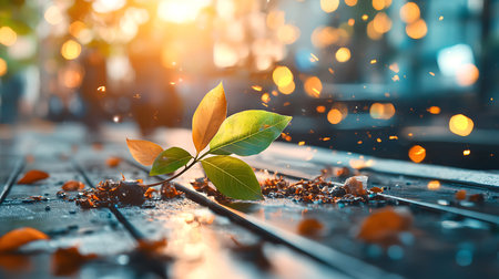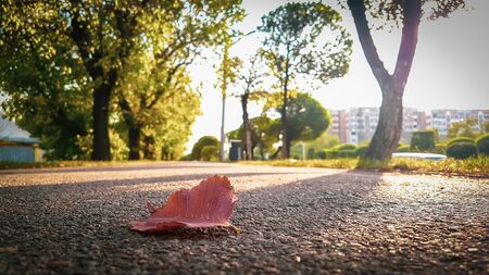 A lone autumn leaf rests on a path, bathed in the warm light of the setting sun.