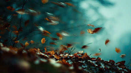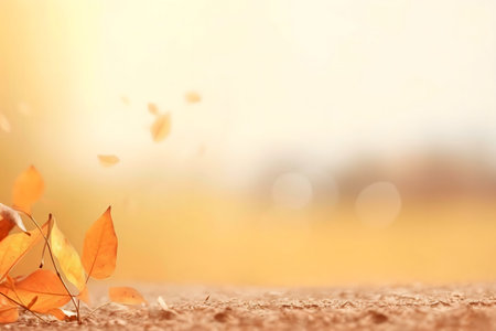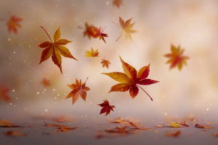 Golden autumn leaves gently fall, creating a serene and peaceful autumnal scene.