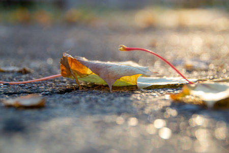 Dry red yellow leaves on the sidewalk in autumn fall on a sunny day