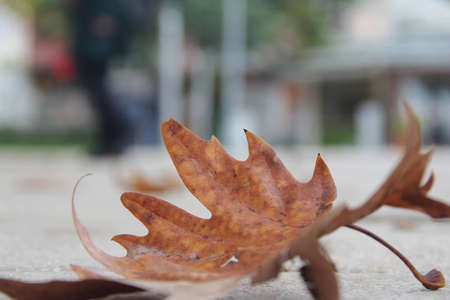 Yellow dry autumn leaf on stone background. Outdoor shot in city park with shallow depth of field.