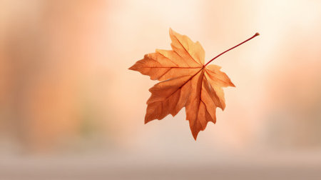 A lone, brown maple leaf gracefully falls, captured in mid-air against a softly blurred forest background. The image evokes a sense of tranquility.