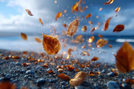 Golden leaves swirl and scatter on the shoreline with waves gently crashing in the background.