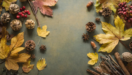 Colorful autumn leaves, berries and cones background. Top view.